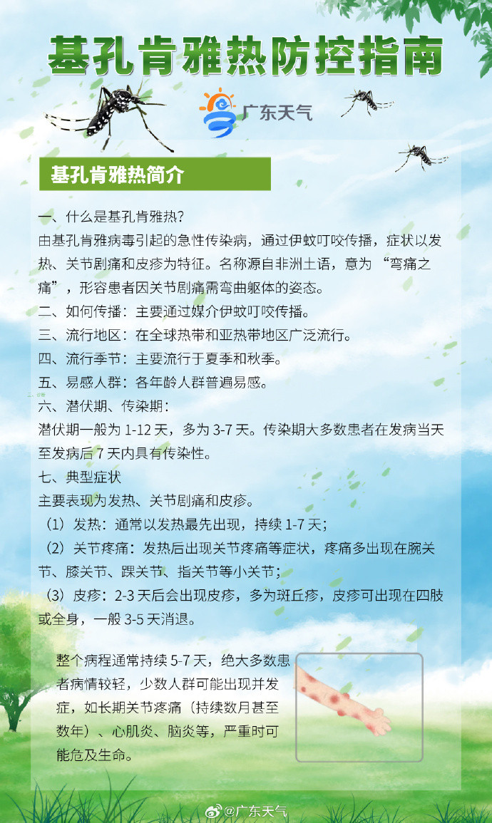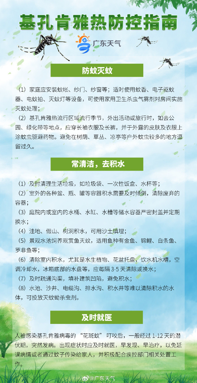 有关部门提示,最近基孔肯雅热多发,请公众要积极行动起来,及时清理家中及周边积水,安装纱门纱窗或使用蚊帐。气温变化影响蚊子活跃度,尤其在日出后2小时及日落前2小时为伊蚊活动高峰,请市民朋友做好防护措施,谨防蚊虫侵扰。