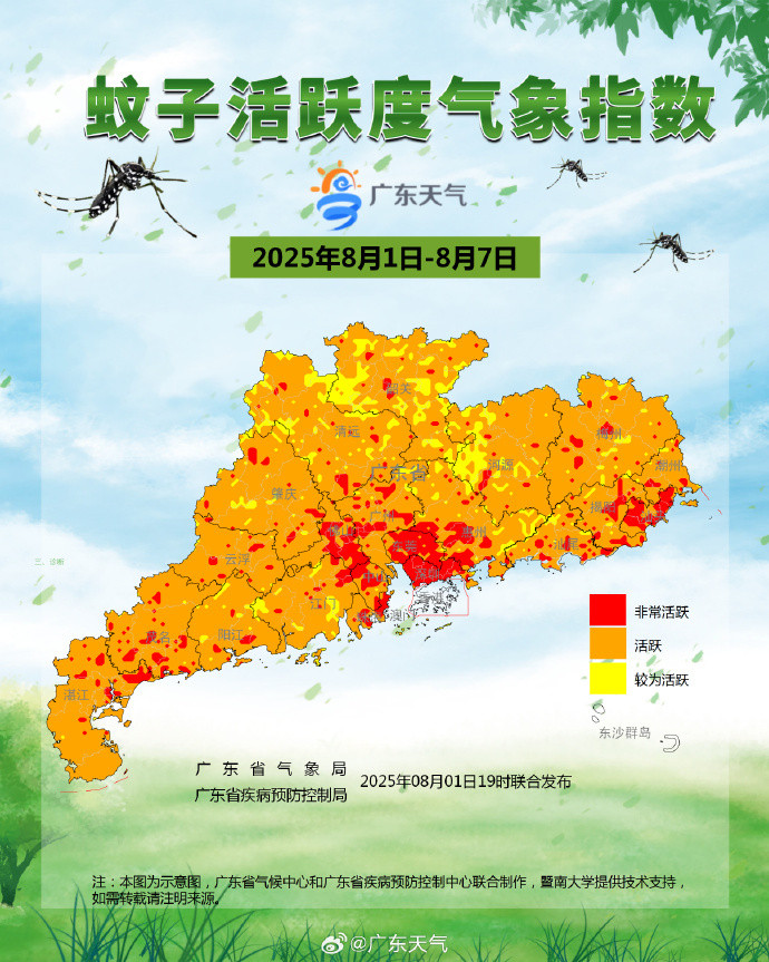 广东省气象局、广东省疾病预防控制局8月1日19时联合发布广东蚊子活跃度气象指数: