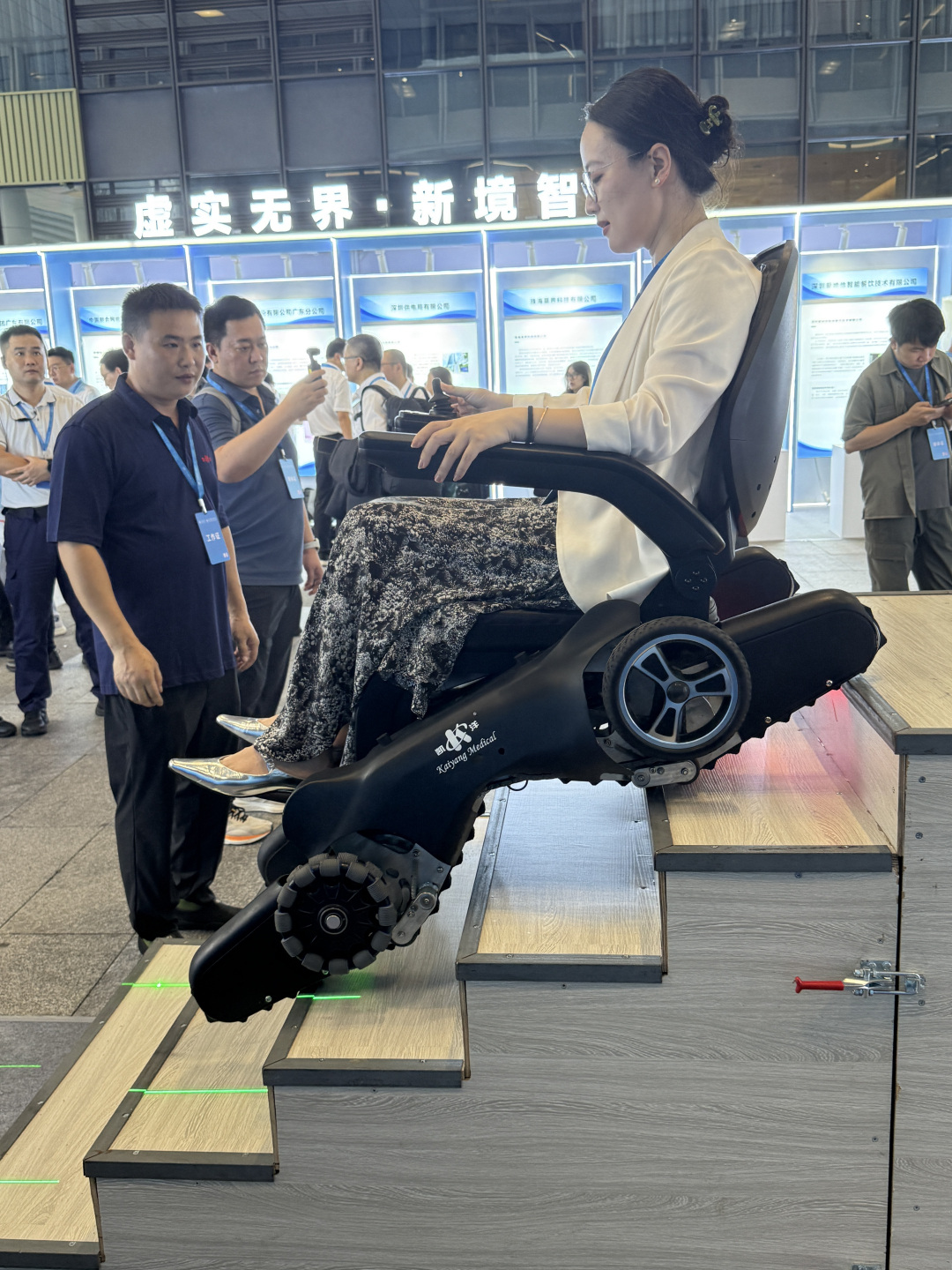 佛山凯洋医疗科技集团有限公司,带来的智能爬楼梯电动轮椅堪称 “全地形王者”。现场展示了爬 45° 凹凸不平的斜坡功能,引来阵阵惊叹。