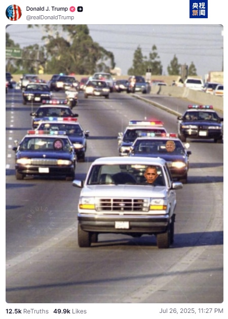 奥巴马驾驶着美国前橄榄球星O.J.辛普森1994年在“杀妻案”中逃亡时所乘坐的白色福特烈马越野车在前面狂飙,而特朗普和美国副总统万斯则带领警队在后狂追。