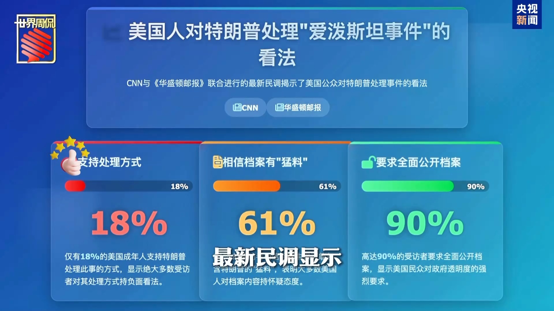据CNN联合《华盛顿邮报》的最新民调显示,仅有18%美国成年人支持特朗普处理此事的方式;61%的人相信档案里很可能有特朗普的“猛料”;高达90%的受访者要求全面公开档案。