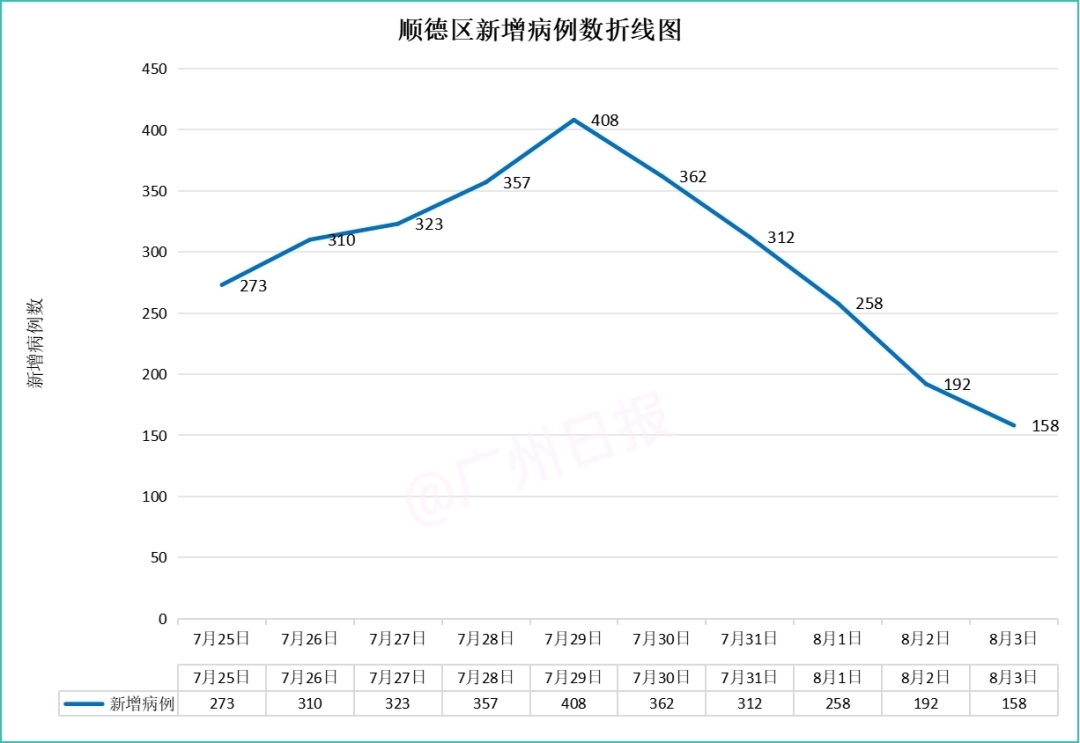 记者注意到,截至目前,从公布的新增确诊病例数来看,顺德7月30日发布的数据达到峰值,为408例;自此,顺德新增确诊病例数呈现下降趋势。从折线图来看,新增病例数大致呈现“倒V”走势,近六日呈现下降趋势。