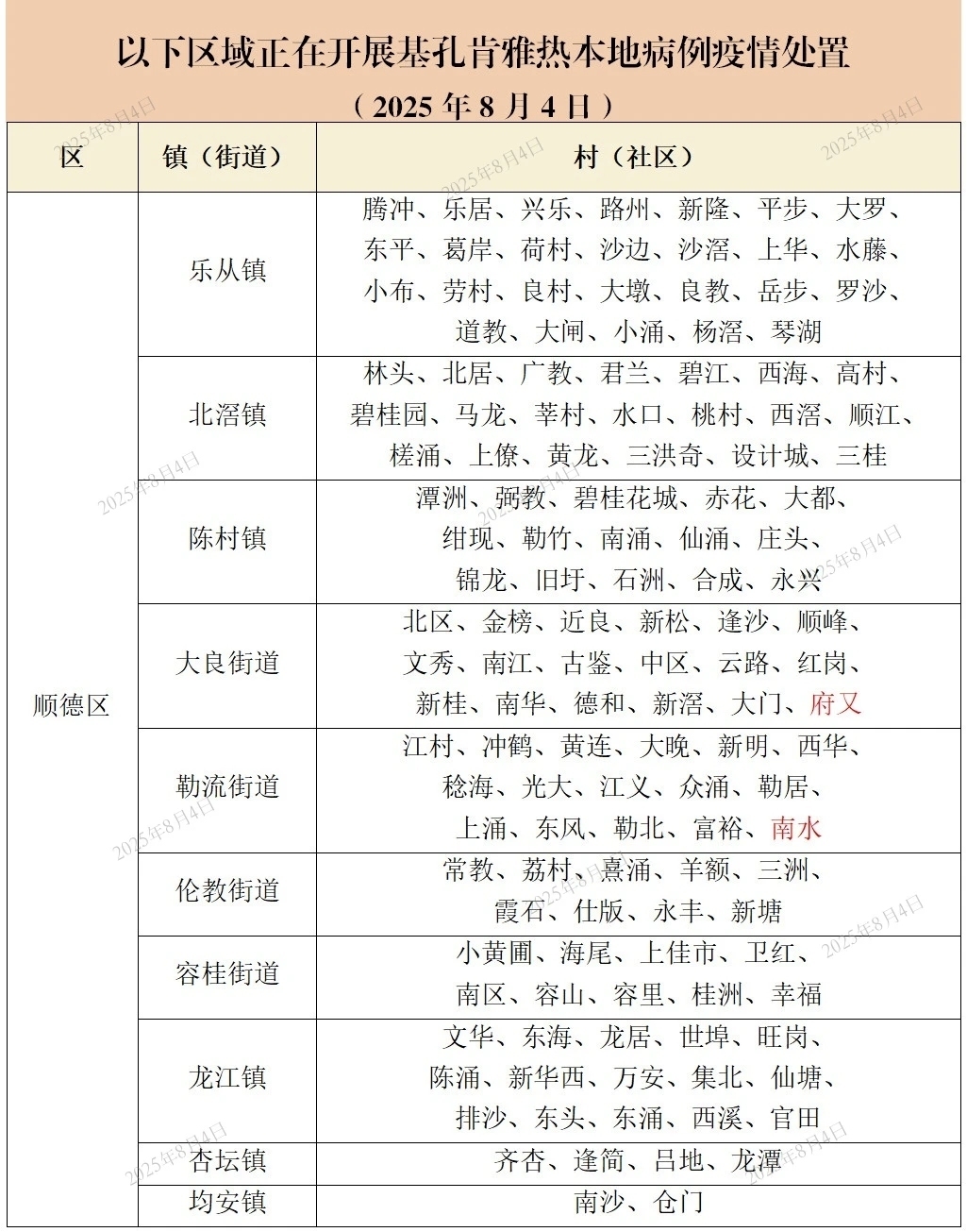 记者还从顺德疾控获悉,8月4日,大良街道、勒流街道分别新增一村居为正在开展基孔肯雅热本地病例疫情处置区域。