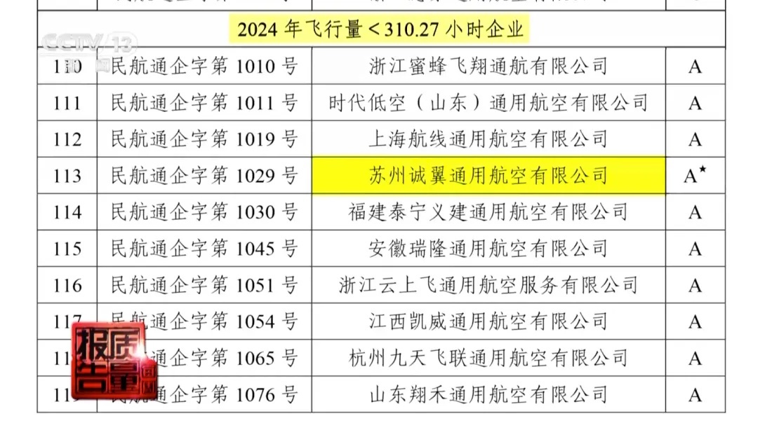 记者在中国民航局官网搜索发现,今年6月10日公布的2024年通用航空企业诚信经营初评结果公示里,“苏州诚翼通用航空有限公司”在2024年开展经营性作业飞行小于310小时,评价结果为A级。同时标注有黑色五角星,表示这家公司在今年经营评价发布日前,发生过通航事故,导致人员死亡。
