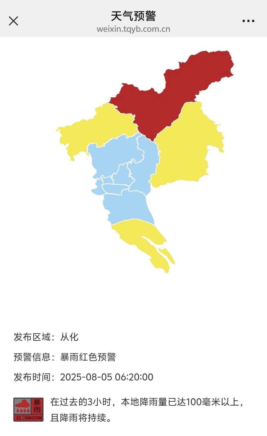 从化区气象台8月5日9时发布,截至5日4时至9时,从化全区平均雨量(单位:毫米)52.4,良口最大达溪230.3,吕田最大莲麻147,其余镇街最大城郊光联72。预计,未来1小时,全区大部强降雨持续,最大小时雨强40-60毫米。良口、吕田暴雨红色预警、其他镇街橙色预警信号正在生效,请加强防御。