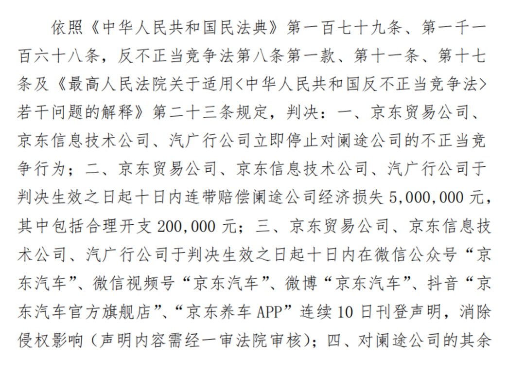 上海知识产权法院二审判决书指出,京东养车实施的“震虎价”低价营销活动,宣传标语中所谓的“价格比友商低5%”,容易使消费者在特定场景下产生误解,属于虚假宣传行为,“震虎价”系列营销活动本身也属于商业诋毁行为,这两种行为均构成不正当竞争。法院判令京东养车立即停止对途虎养车的不正当竞争行为。同时,上海知识产权法院还判决京东养车赔偿途虎养车经济损失500万元,并要求京东养车在判决生效之日起十日内,在“京东汽车”的微信公众号、视频号、微博,京东汽车官方旗舰店抖音号及京东养车APP连续10日刊登声明,消除对途虎养车的侵权影响。