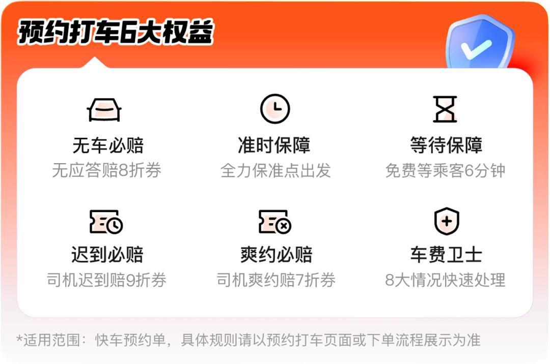 基于用户对出行的时效需求,滴滴升级6大权益保障,包括无车必赔、准时保障、等待保障提升用车体验。无车必赔的背后,是滴滴通过优化产品提升的派单能力。如临近出发时间的预约单仍无司机接单,平台将匹配附近3公里内的司机前来接驾,以保障用户有车出发;准时保障为用户提供出行确定性,尽全力确保用户可以在预约时间准时上车;等待保障为用户临行前的小调整提供了缓冲时间,司机在预约出发时间到达上车点后,可免费等待6分钟,也请大家注意订单出发时间,准时上车。