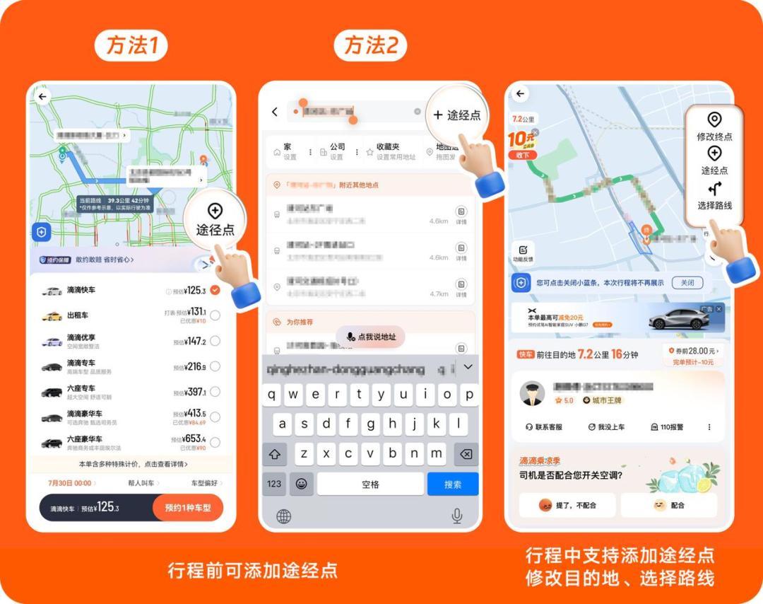 此次升级新增了添加途经点、修改目的地、选择路线功能。在行程前和行程中,用户都可添加途经点,方便顺路办个事儿等需要中途临时停车的情况;在行程当中,用户还可根据实际需要修改目的地,或根据喜好选择路线,方便应对行程中的需求变化。使用添加途经点、修改目的地和选择路线功能后,订单金额将随实际行程产生变化,请大家合理安排行程,注意订单变化情况。