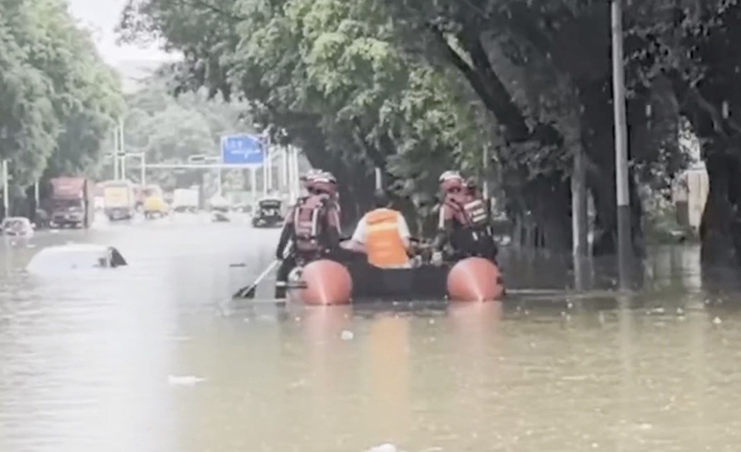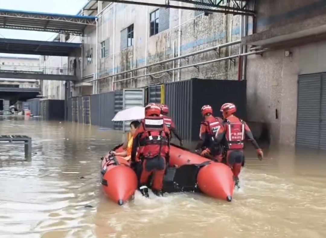 当天,深圳坪山区某工业区出现积水情况,并有人员被困,接警后深圳消防紧急救援,利用橡皮艇分批次转移被困人员。