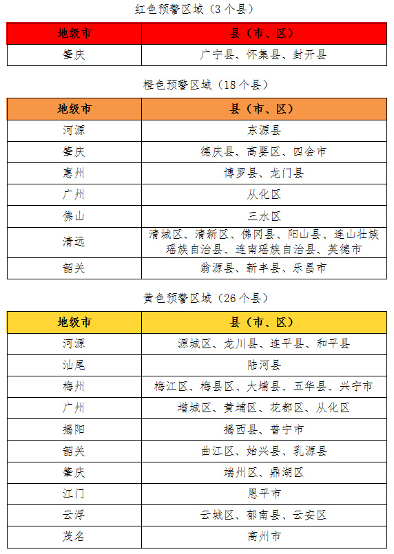 河源源城区、龙川县、连平县、和平县,汕尾陆河县,梅州梅江区、梅县区、大埔县、五华县、兴宁市,广州增城区、黄埔区、花都区、从化区,揭阳揭西县、普宁市,韶关曲江区、始兴县、乳源县,肇庆端州区、鼎湖区,江门恩平市,云浮云城区、郁南县、云安区,茂名高州市,局地发生山洪灾害可能性较大(黄色预警)。