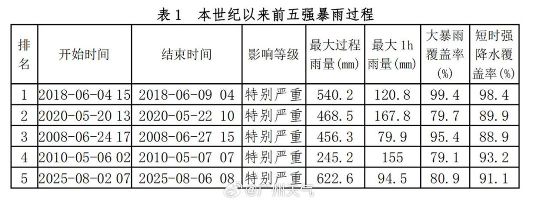 据广州市生态与农业气象中心监测,8月2日至6日出现今年以来最强暴雨过程,已经达到特别严重影响等级,为8月最强暴雨过程,本世纪以来第5强。