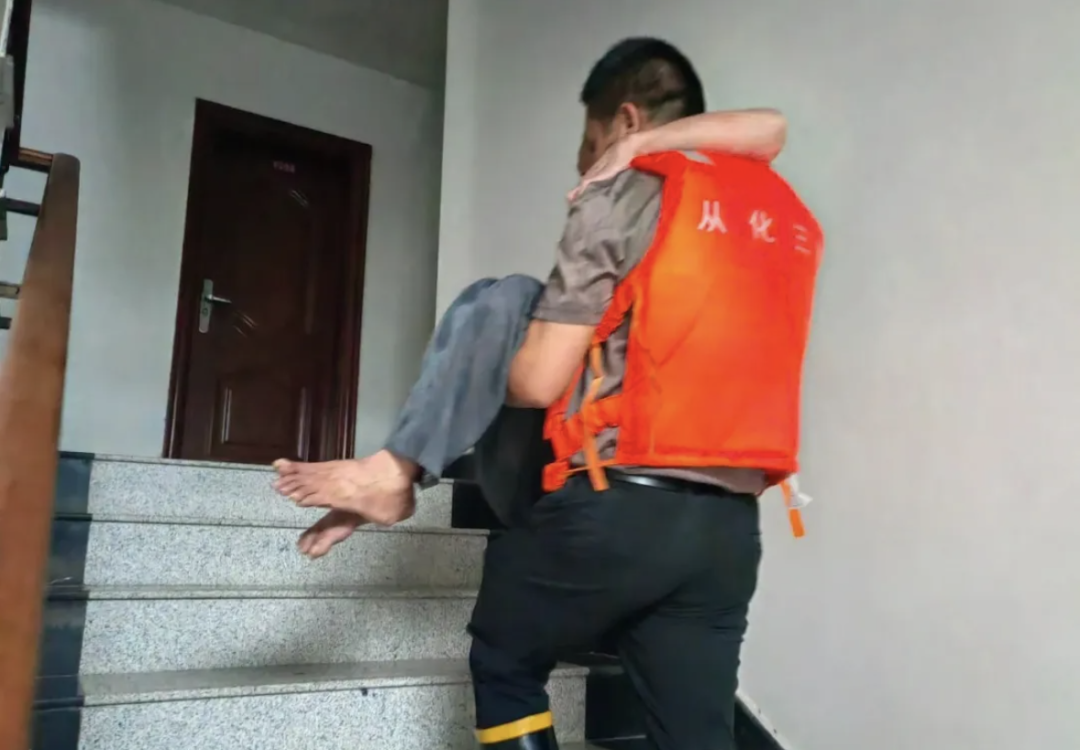 镇村干部入户逐一排险时,水塘社白爷爷水位比别处更深,年过八旬的白爷爷因身体原因生活难以自理,几乎无法活动。老伴同样高龄,子女皆在外工作未能赶回身边。现场救援干部卷起裤脚、踩进积水,立刻展开了紧急救助。有人用扫把铁铲持续向外泼水,有人迅速在门口码上沙袋组成临时堤坝,阻挡水流再涌入。