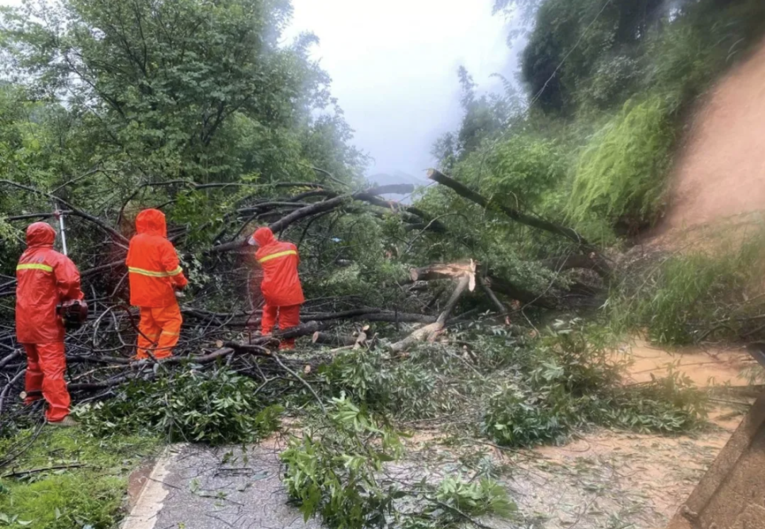 “G105线吕田镇塘基村路段出现山坡杉树横跨路面,阻断了过往车辆通行。”8月5日10时53分,从化区住建交通局应急抢险人员发现G105线K2434+100(吕田镇塘基村路段)出现交通中断的情况,立马设置安全警示标志,携带油锯、高枝剪等抢险清障机具,冒着大雨争分夺秒对倒伏树木进行切割、挪移、清扫,仅用时23分钟便恢复了车道通行。