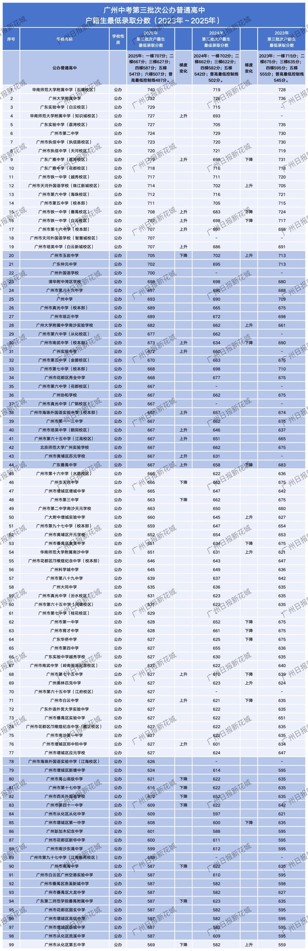 2025年广州中考第三批次录取中,共有20所中学(含公民办普高不同校区、中外合作办学项目,下同)户籍生最低录取分数(以下简称“分数线”)达到普高第一梯度线及以上,比2024年多6所、比2023年多7所,是近三年来上“一梯线”学校数最多的一年,其中包括19所公办普高、1所民办高中公费班;39所中学(校区)分数线达到普高第二梯度区间;47所中学(校区)达到第三梯度区间;27所中学(校区)上线第四梯度。