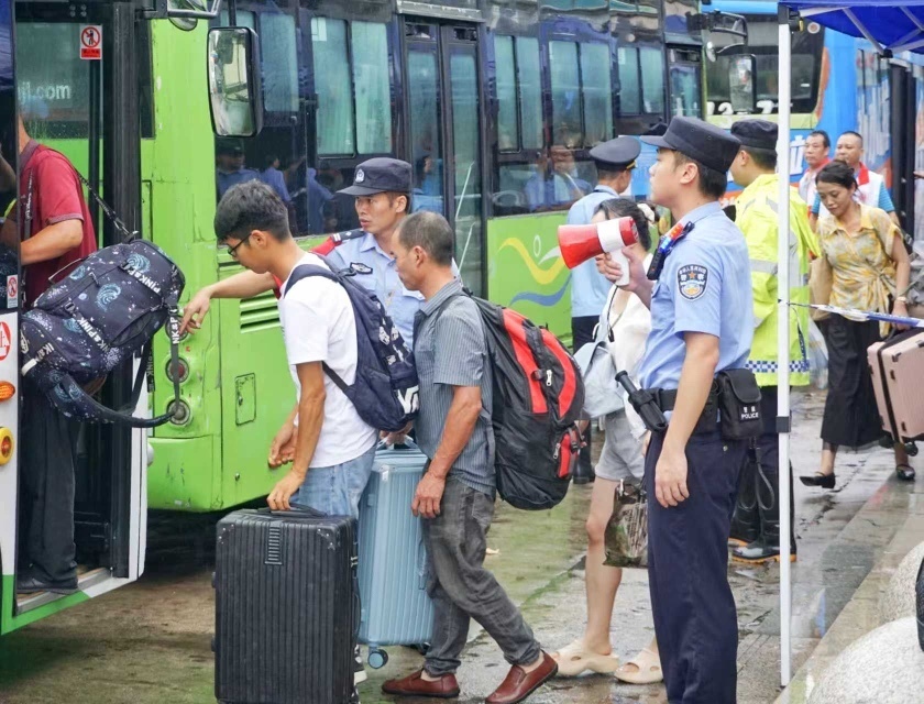 12时许,雨势不断加大,旅客转运工作正式开始。韶关东站派出所15名民警在站台、地下通道、出站口疏导旅客出站,指引有序登乘转运公交车;派警组协同车站工作人员到候车室、卫生间进行人员清退,避免旅客错过通知导致滞留车站;其余民警与地方公安机关和客运人员开展联勤联动,将旅客有序转运至韶关高铁站,全方位为旅客保驾护航。当日18时,1万余名滞留旅客全部安全顺利转运至韶关高铁站。