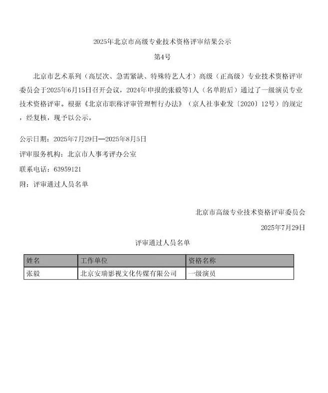 公示显示,北京市艺术系列(高层次、急需紧缺、特殊特艺人才)高级(正高级)专业技术资格评审委员会于2025年6月15日召开会议,2024年申报的张毅等1人(名单附后)通过了一级演员专业技术资格评审。根据《北京市职称评审管理暂行办法》(京人社事业发(2020)12号)的规定,经复核,现予以公示。公示日期为2025年7月29日-2025年8月5日。