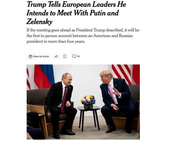 据报道,知情人士称,特朗普在6日与泽连斯基等欧洲领导人通电话时透露了这一计划。会谈仅限于美俄乌三国领导人参与,不会包括其他欧洲国家领导人。