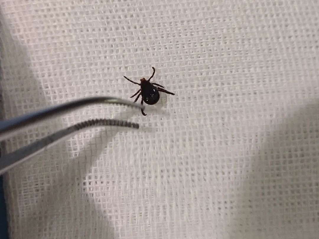 在处置过程中,该医院医生先用酒精对蜱虫及周围皮肤进行消毒,使用弯头眼科镊尽量贴近皮肤,夹住蜱虫头部,小心翼翼地将紧紧吸附在皮肤上的虫体取出,并对创面进行消毒处理。