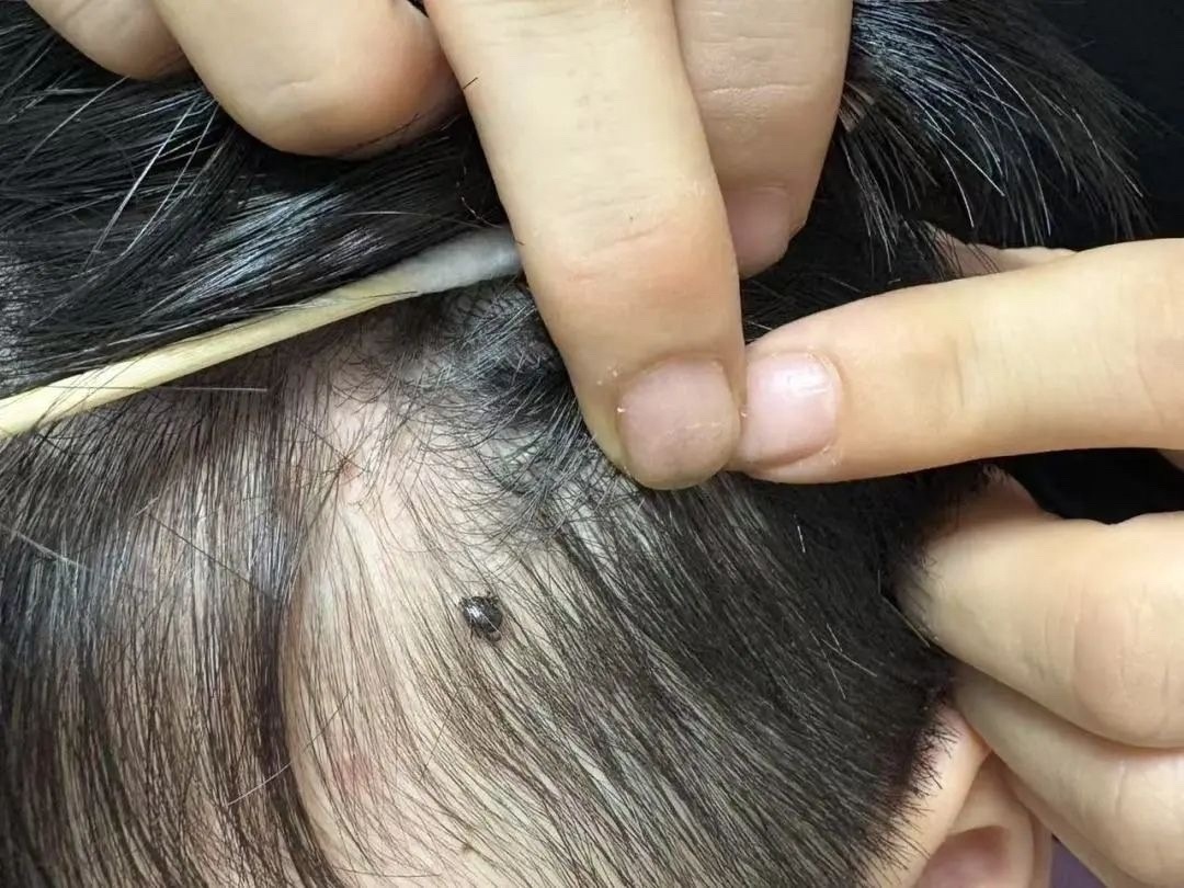 近日,六岁男童轩轩(化名)的家长发现孩子头顶莫名多出一粒“绿豆”,仔细查看后竟发现是一只活体昆虫,其头部已深深嵌入头皮。惊慌之下,家长立即带孩子前往番禺区第二人民医院就诊。