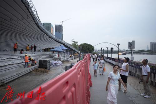 广州塔底下正在进行的大台阶工程即将收尾,未来游客从二层平台下来后直接就能散步到江边。