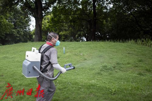 二沙岛,工作人员在草坪上喷灭蚊药水。