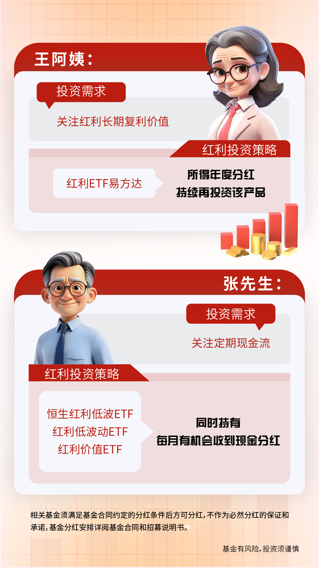 “虽然投资红利指数基金会面临股票波动的风险,要做好长期持有的准备,但我不求一夜暴富,只求能在长期稳健地积累财富,让退休生活更充裕些就好。”王阿姨的话,或许道出了很多普通投资者的心声。