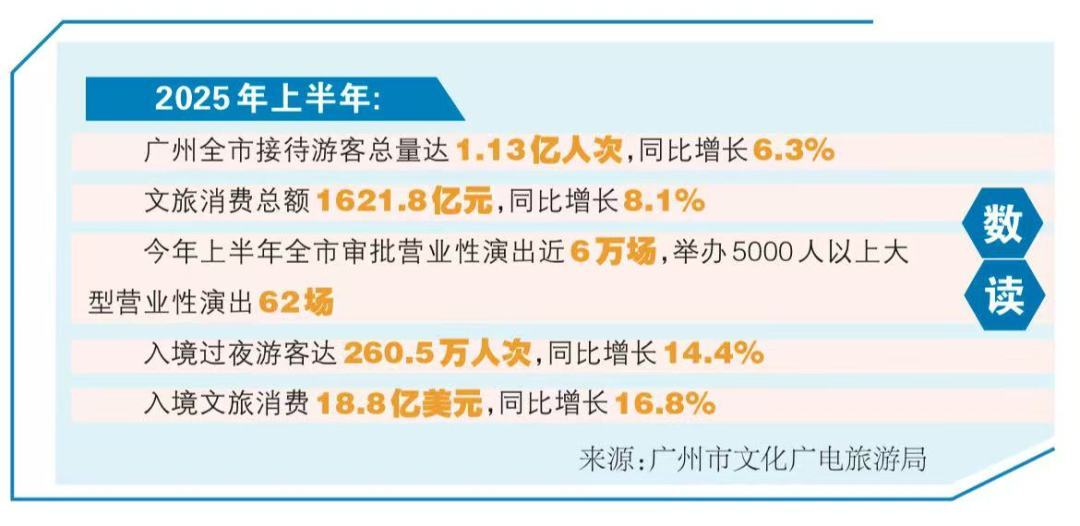除此之外,“跟着赛事去旅行”“跟着演出去旅行”等旅游方式的兴起,带动了“票根经济”的发展。仅8月份,广州每个周末至少有1—2场大型演唱会上演,“演唱会之城”在暑期亦不冷场。同时,2025年广州艺术季助阵暑期演艺游,精品剧目轮番上演、文艺名家闪耀舞台、惠民演出广泛开展、新型演艺业态蓬勃兴起,吸引大批游客远道而来观演。