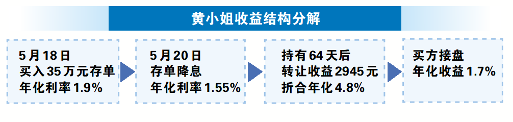 黄小姐透露,她买入了35万元三年期大额存单,仅持有64天就完成转让,期间收益2945元。按此计算,这笔资金的年化收益率高达4.8%,远超当前多数存款产品的收益水平。