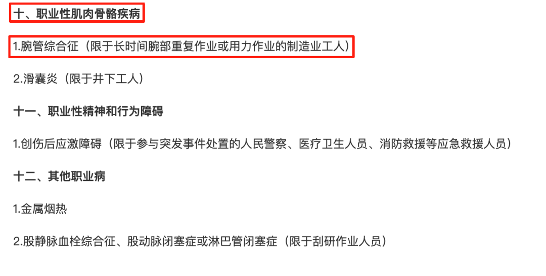 根据目录规定,“职业性腕管综合征”的认定仅适用于长期从事腕部重复性施力作业的制造业工人,如装配线操作工、机械维修工等需持续使用气动工具或高频手工操作的岗位。