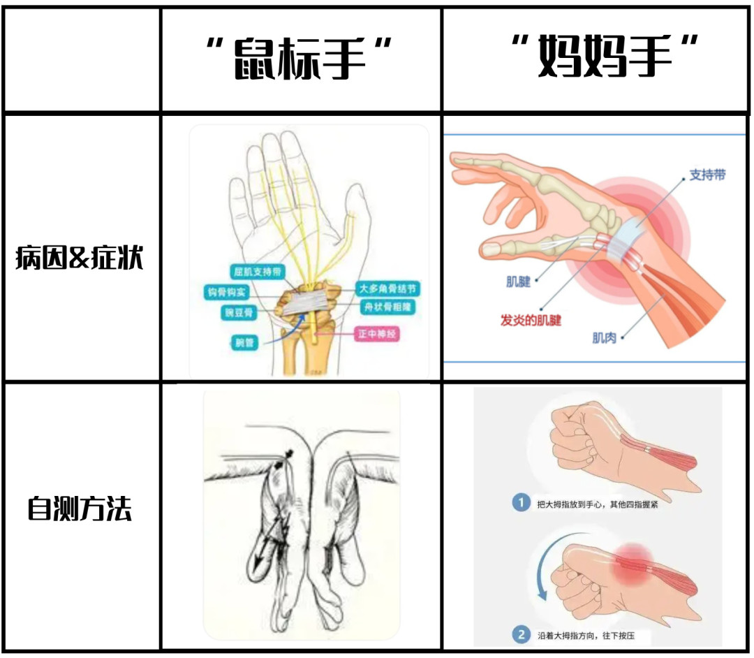 需要提醒的是,大家很容易把“鼠标手” 和“妈妈手”或颈椎病引起的手臂不适的症状混淆,延误了治疗。事实上,它们在病因、症状等都有明确的区别。