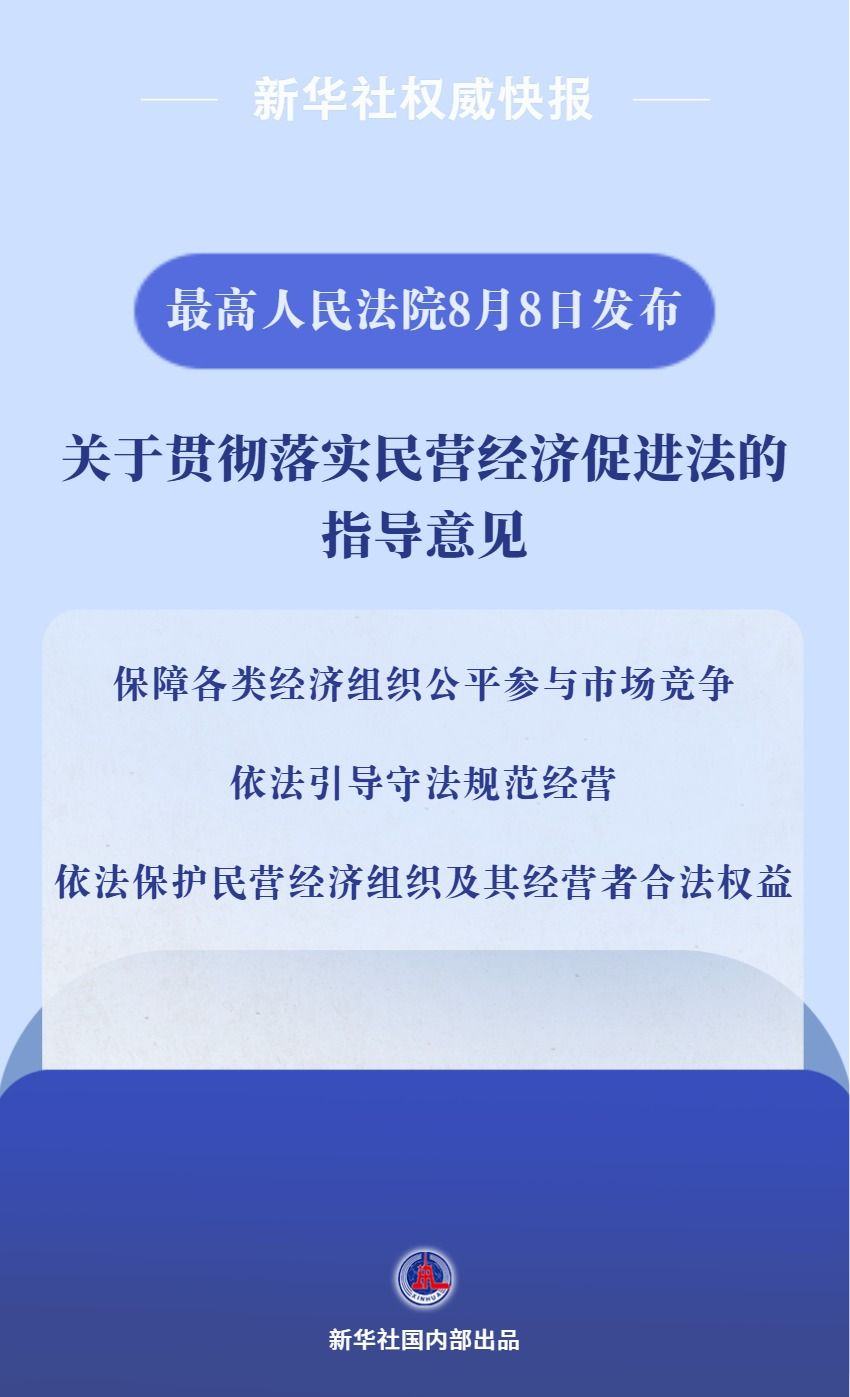 今天(8日),最高人民法院发布《关于贯彻落实〈中华人民共和国民营经济促进法〉的指导意见》。《指导意见》从五部分提出司法保障民营经济发展壮大的具体举措,旨在破解民营经济发展中面临的难题,为民营经济健康发展提供更加有力的法治保障。