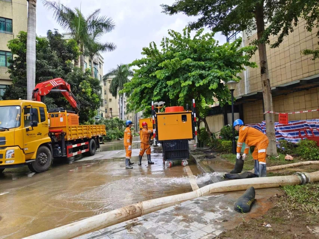 8月5日,国家级电力应急特勤队22名队员携带大流量排涝车、高机动排涝方仓、排涝机器人、手机充电车等装备赶往东莞。在随后的48小时内,特勤队员们连轴转,完成了华泰大厦等8个小区超过1.5万立方米排涝任务。