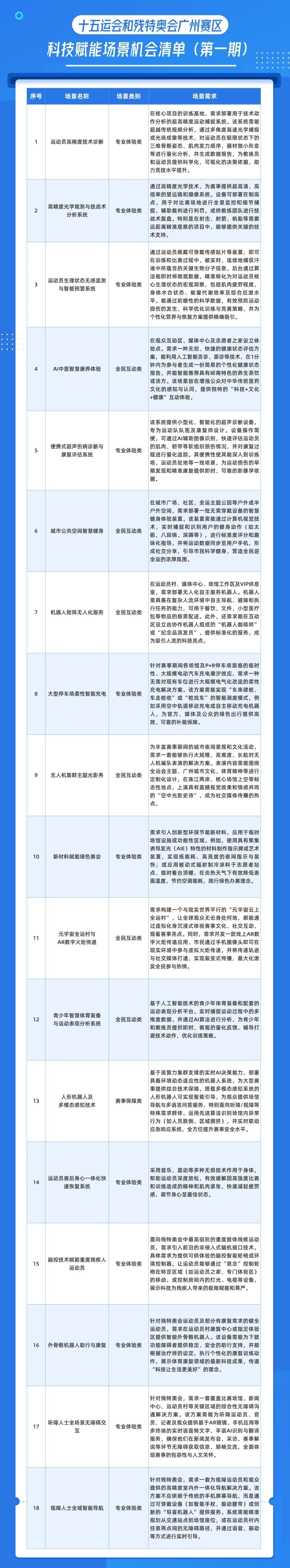 8月8日,在全国第17个“全民健身日”到来之际,十五运会和残特奥会广州赛区举行科技赋能场景机会清单发布会,发布会由十五运会和残特奥会广州赛区执委会与广州市科学技术局联合主办,清单罗列18个场景,推动各类新技术、新产品、新模式在赛事中首试首用,构建“赛时炫科技、赛后留产业”的闭环生态,助力广州打造成为全球瞩目的“超级城市场景创新标杆”。广州日报新花城记者了解到,这18个场景涵盖专业体验、全民互动、赛事保障三大类别,每个场景均聚焦“高价值、可落地、能转化”特性,向全球创新主体发出“揭榜”邀请。