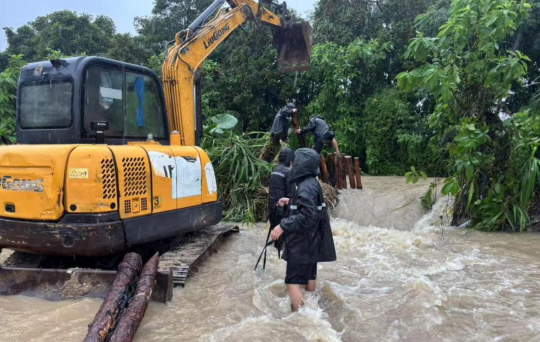 8月5日下午,雨势依然凶猛,夹坑河决堤处水流湍急。卢永锐、邝国江代表与应急救援队队员一同,冒着风雨在激流中开展抢险工作。他们有的搬运沙袋,有的加固堤坝两侧,有的在水中搭建临时挡水设施,大家分工明确、配合默契,争分夺秒地与洪水赛跑。