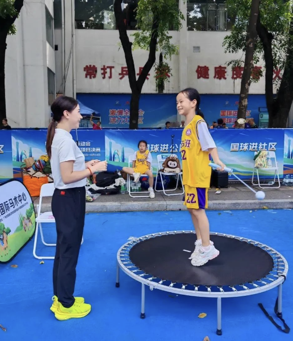 值得关注的是,活动现场,中国蹦床运动员、第29届和第31届世界蹦床锦标赛单跳女子团体冠军蔡琪子来到现场指导孩子们蹦床。她走进游戏区,手把手指导孩子们调整动作,用亲切互动让孩子们感受专业运动的魅力。