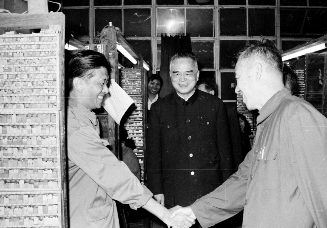 1982年春节前夕,省市领导梁灵光(中)许士杰(右)和广州日报李梅生(左)在排字房。