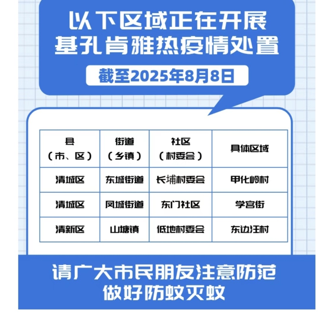 当前是基孔肯雅热的流行季节,截至2025年8月8日清远甲化岭村等区域正在开展基孔肯雅热疫情处置,请广大市民朋友注意防范勤倒积水,防蚊灭蚊。