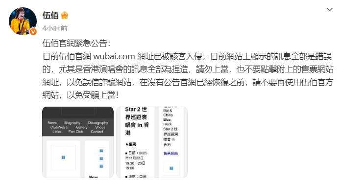 今日,歌手伍佰在微博等个人社交平台发布紧急公告,其官网被黑客入侵,发布信息多不实。