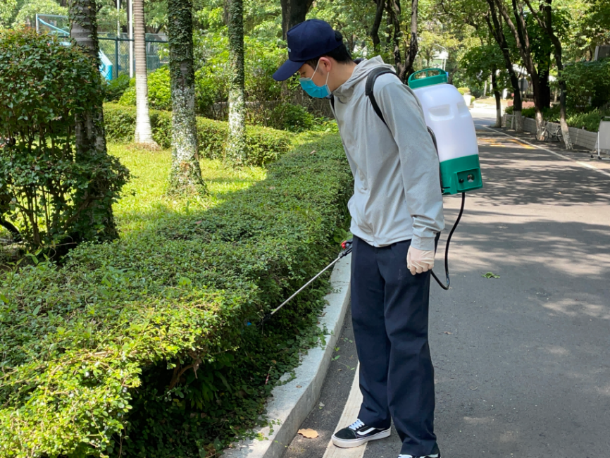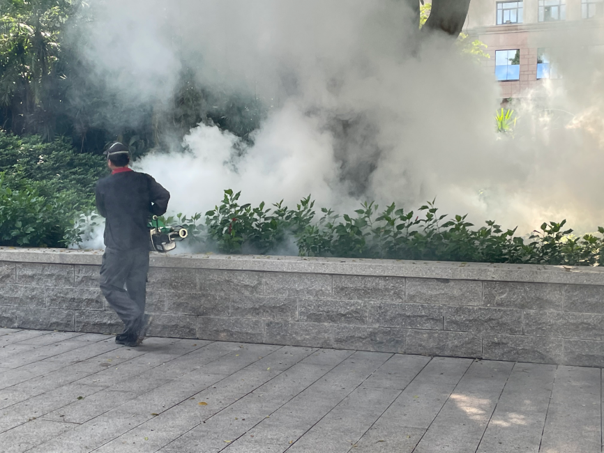 在中山大学北校园内,10余名消杀队员身着防护服,肩背喷雾器、手提烟雾机或拎着灭蚊药,分头奔赴教学楼、宿舍楼、草坪、排水沟等重点区域,展开“地毯式”喷药灭蚊。