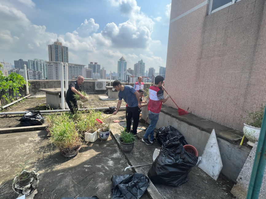 当天,记者在马棚岗社区看到,由街道挂点科室、物业、在职党员、楼组长和社区工作人员等组成的25人小分队正在分组行动,对居民楼天台、花园、菜园等重点区域展开集中清理,倒积水、清杂物、除杂草、铲青苔、拔枯枝。同时,他们还对沿街商铺进行巡查,动员商户积极清理门前和室内杂物、积水。