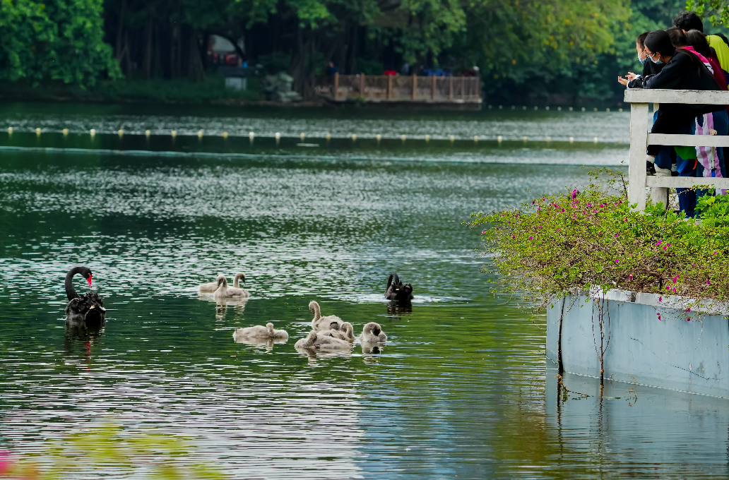 推进水域生态修复,重塑湖水健康肌理。流花湖以清水生态系统构建技术为核心,以“改环境-修生态”为主线,多措并举开展生态修复。针对不同湖区的污染程度分区治理,分阶段推进一湖、三湖和二湖治理;进行底泥改良,通过抽干湖水、晾晒底泥、施撒生石灰等措施灭杀病菌并降低污染物浓度;高密度种植苦草等沉水植物,吸收营养盐并提升溶解氧浓度,构建清水稳态;移除入侵和草食性鱼类,投放鳜鱼等肉食性鱼类及底栖动物,优化水生动物群落配置,促进生态平衡;构建廊道,并在于鹭岛种植鸟饵植物,搭建栖息架,打造闹市中的“小鸟天堂”。数百只鹭鸟在此栖息繁衍,水鸟翔集,近年来,共记录鸟类113种,同比新增59种,更有白鹇和褐翅鸦鹃等8种国家II级重点保护野生鸟类,成为流花湖生物多样性和生态系统健康发展的生动证明。