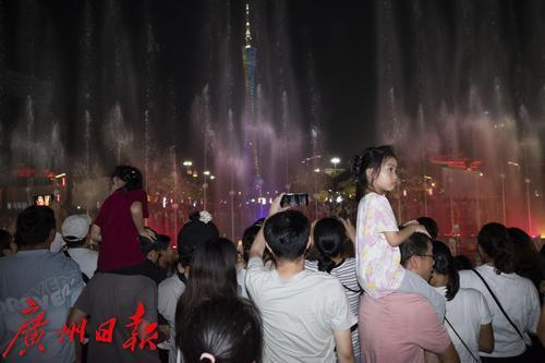 孩子们坐在家长脖子上观看花城广场音乐喷泉。