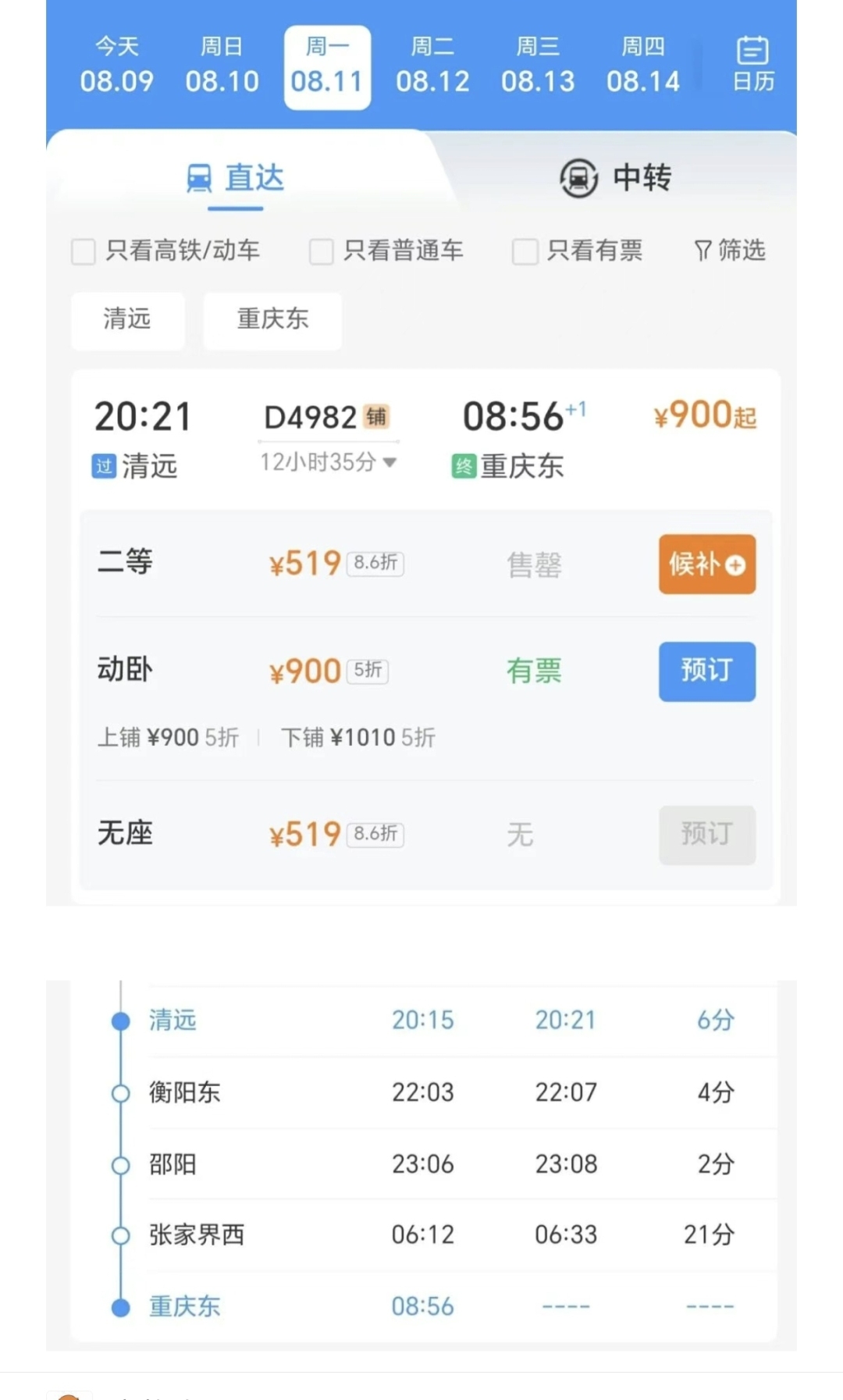 清远站相关负责人告诉记者,列车20:21清远始发,次日6:12抵张家界西,二等座票价320元,动卧票价550元;8:56终到重庆东,二等座票价519元,动卧票价900元。清远到张家界约9小时51分,到重庆约12小时35分。根据火车票提前15天预售规则,现在已经可以购买这些车次的火车票。