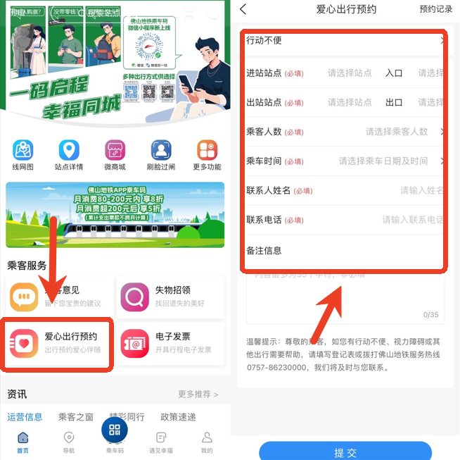 据佛山地铁介绍,本次升级后还特别推出了接驳高铁、城际爱心预约服务。乘客若有特殊需求,如希望工作人员陪伴送至高铁/城际站点,或者需要在高铁/城际站点接站前往搭乘地铁,可通过佛山地铁App或服务热线(0757-86230000)预约,补充目的站点,车次、预计到达时间等相关信息,工作人员将协助乘客完成进出站等相关服务。若乘客无特殊说明,工作人员将默认仅在地铁出入口进行接送。目前,高铁、城际换乘站点车站包括:佛山地铁2号线广州南站、张槎站,佛山地铁3号线顺德学院站、北滘西站、东平站、佛山西站。