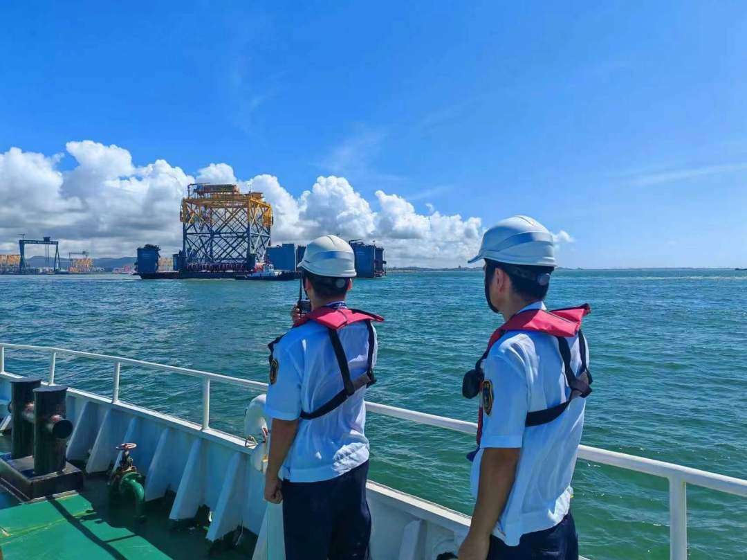 据介绍,为全力保障“龙宫号”拖带出运及定点投放,揭阳海事提前谋划,做好重点服务保障工作:一是开辟绿色通道,高效办理项目水工许可;二是联合港航部门、业主、施工单位等开展通航评估,指导制定拖带、投放作业通航安全保障方案,明确作业气象海况条件;三是出运投放期间,实现“VHF+无人机+光电雷达+海巡船”四位一体监管护航模式,提前发布航行安全信息并疏导周边船舶有序避让,全力保障平台安全顺利出运与定位作业。