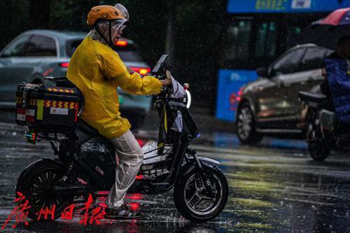雨中送餐的外卖小哥,穿着雨衣也难免裤脚全湿。