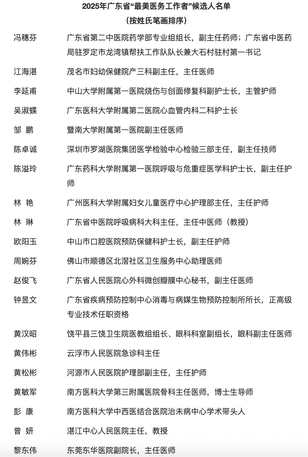 8月11日,广东省卫生健康委官网发布了《关于2025年广东省“最美医务工作者”候选人的公示》。根据省卫生健康委、省委宣传部、省文明办联合开展的2025年广东省“最美医务工作者”宣传选树活动安排部署,近期在全省组织开展了推选工作。经各地各单位推荐、评审专家组评议,现对20名候选人进行公示。