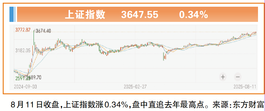 截至8月11日收盘,上证指数涨0.34%报3647.55点,深证成指涨1.46%,创业板指涨1.96%。昨日沪指盘中最高报3656.85点,距离去年阶段性高点已不足20个基数点。
