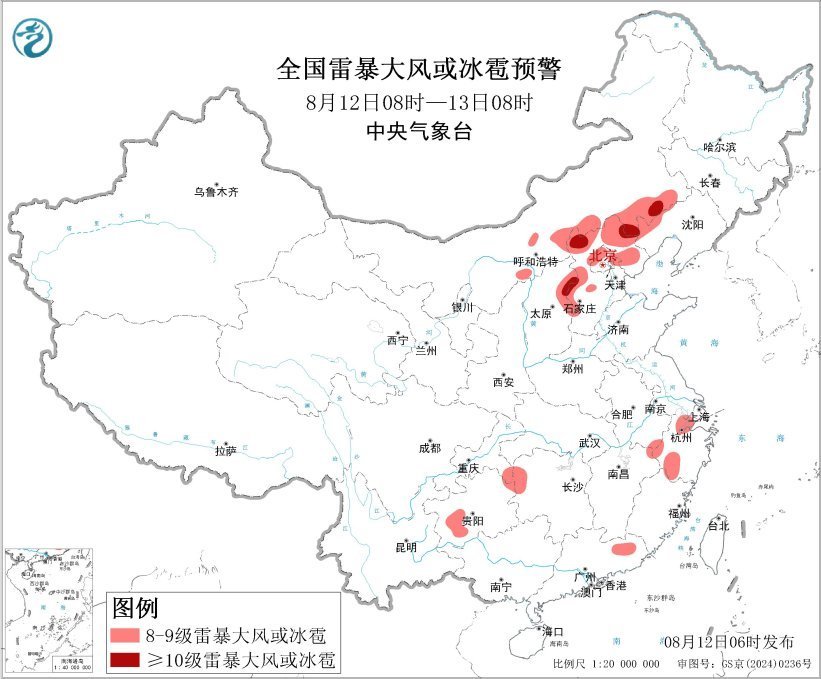 预计8月12日8时至13日8时,内蒙古东南部、华北中北部、西南地区东部、江南东部等地的部分地区将有8级以上雷暴大风或冰雹天气,其中,内蒙古东南部、山西东北部、河北中北部等地的部分地区将有10级以上雷暴大风;内蒙古东部、华北中北部、江淮、江汉、江南中东部、西南地区东部和南部、华南东部和南部等地的部分地区将有小时雨量大于20毫米的短时强降水天气,其中,内蒙古东南部、河北中部和东北部、湖北南部、湖南西北部、浙江北部、贵州西南部、广东中部和西南部、海南岛东北部等地的部分地区小时雨量大于50毫米,最大可达60毫米以上。