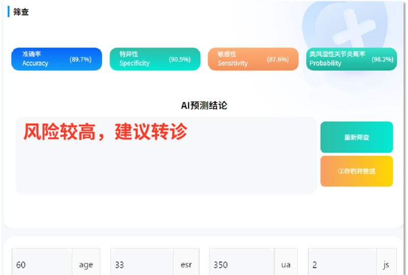 家住深圳大鹏新区的60岁陈叔,因双手指关节酸痛肿胀、晨僵明显,前往社区健康服务中心就诊。全科医生陈俊发现其症状与RA早期表现高度吻合,但基层缺乏专科诊断条件。通过抽血检测血沉、尿酸等基础指标后,陈俊将11项血象及临床数据输入“AI-RA早筛模型”,几秒钟便得出“高风险,建议转诊”的结果。